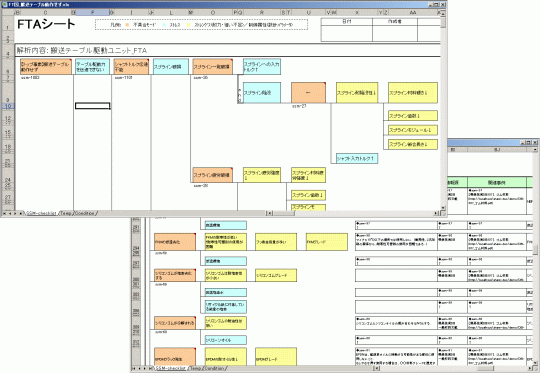 Excelマクロを利用し、検索結果の因果連鎖知識を予めデザインしたFT図テンプレートに自動的に出力させます。この処理によって、大きな手間をかけることなくFTAに反映すべき組織共有知識を確実に検討することができます。また大きな負荷なく、FT図のベースを作成することができます。(Excelのセルを利用する場合は、表形式である制約上、論理記号などの記号を表記できないため、AND事象の場合はセル罫線の種類を変えるなどの工夫を施します。)