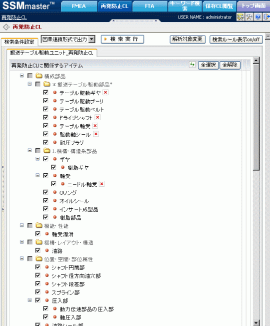 辞書構築機能で予め構築した再発防止チェックリスト用の解析入口から、チェックリストの対象となるユニットを選択します。過去トラブルの知識のみを絞込むので、知識絞込み用のプロパティ欄では「設計再発防止CL」が予めチェックされています。(この点が、広く一般知識を検索に含めたFMEAの進め方と異なります。)