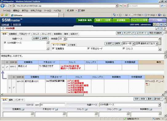 SSM知識の登録や編集が容易に実施できるように、当該知識ベースのSSM知識や他の知識ベースのSSM知識を参照することができます。知識IDは知識ベースごとに割り当てることができます。また定義属性、制御属性、ストレングス、ストレス、不具合モード、形態置換語といったSSM理論の要素がフィールドとして予め用意されているので、容易に知識を登録することができます。それ以外にも再発防止策、重要度などといったフィールドを自由に追加することができます。