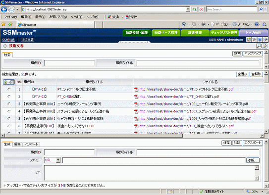 SSM知識を作成するための不具合事例、試験報告書、設計基準書などの技術文書の情報を登録・編集・閲覧することができます。各技術文書をSSM知識に関連付けることによって、SSM知識の検索結果から該当する文書を閲覧し、故障メカニズムの詳細を把握することができます。